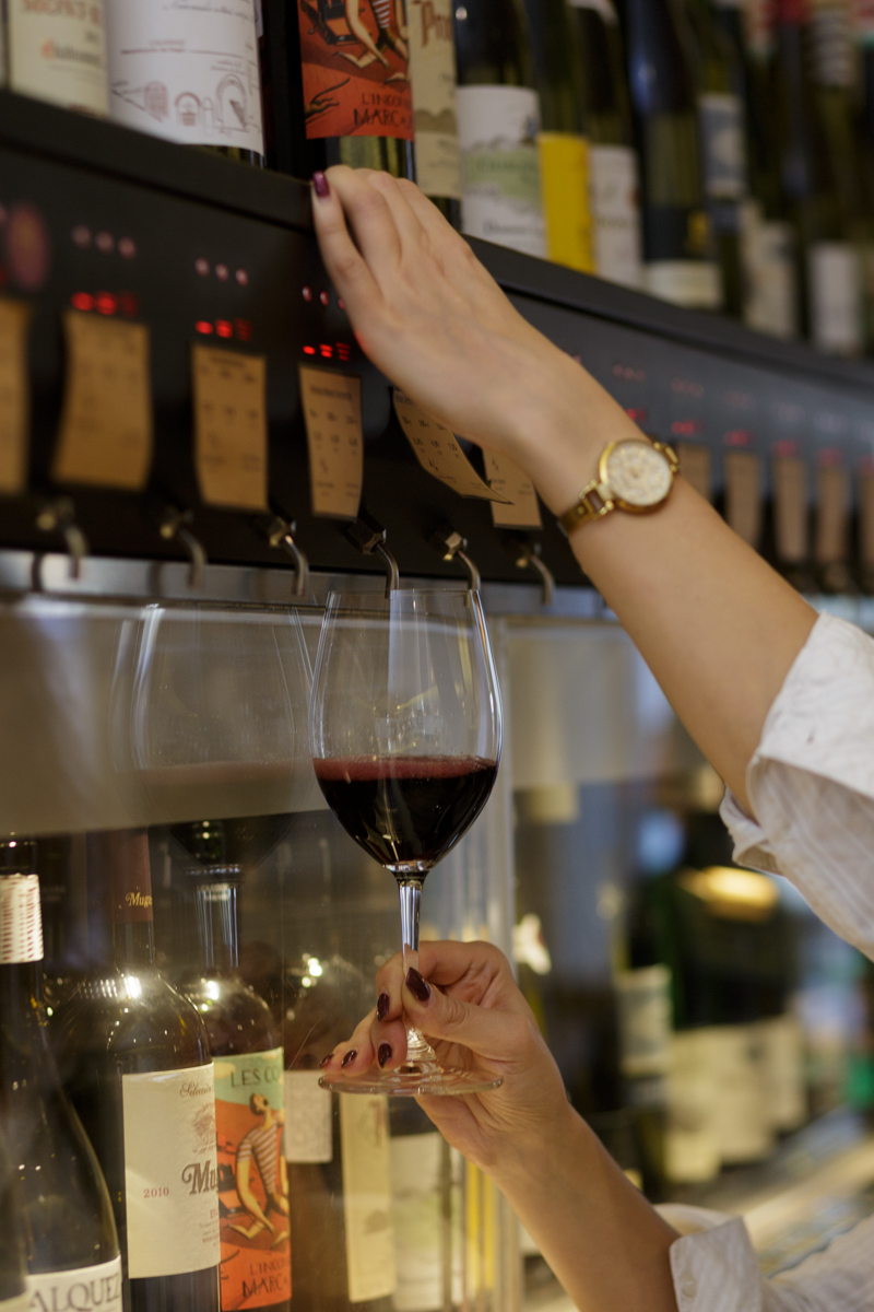 Easy Wine baarin konsepti on yksinkertainen ja kerrassaan loistava, eikä tippaakaan snobbaileva vaikka tarjolla on huikeat 60 viiniä ja kaikki laseittain. Ravintolassa tarjoilijalta saa viinilasin ja muovikortin, jolle on ladattu 50 euroa. Kortti sisään viiniautomaattiin, napin painalluksella valitaan viini ja määrä (50 ml, 100 ml tai 150 ml) ja juuri oikean lämpöinen viini valuu lasiin. Maistellut viinit maksetaan lähtiessä, koko summalla ei ole pakko juoda.