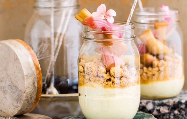 Herkkä ja kaunis raparperi-valkosuklaajälkiruoka on kuin kakku ylösalaisin.