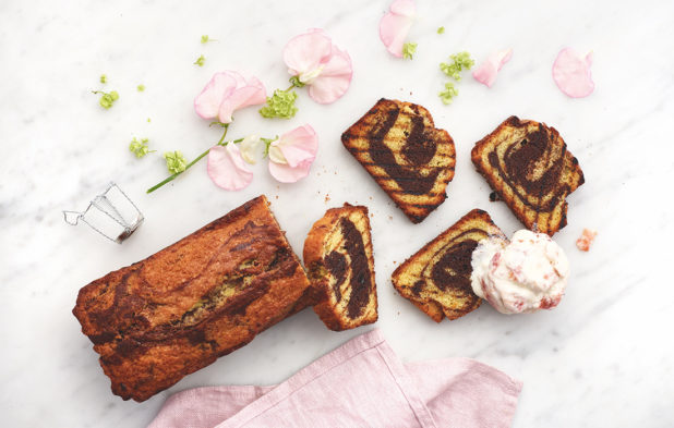 Tiikerikakku saa rusketusraidat grillissä. Tarjoa sen kanssa ilman jäätelökonetta valmistuvaa raparperijätskiä kevään ensimmäisistä raparpereista.