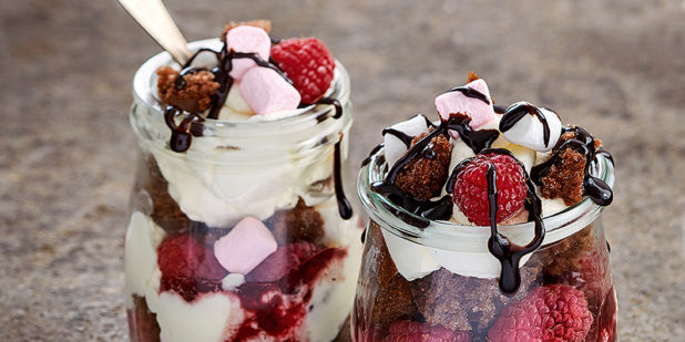 Suklaata, vaahtokarkkia, kermavaahtoa ja marjoja, mitä muuta voi toivoa. Valmista leivokset rennosti lasiin ja nauti kuohuviinin kera.