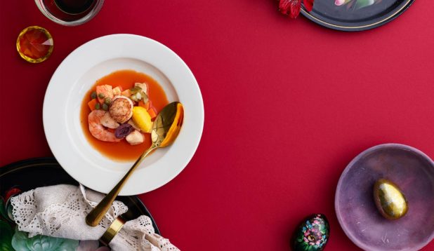 Seljanka on venäläinen kalakeitto, joka nautitaan sahramilla maustetun smetanan ja mineraalisen silvaner-viinin kanssa.