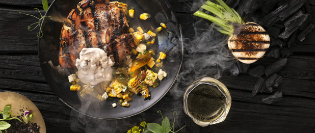Kesän kaunein grilliruoka syntyy grillissä kypsennetystä leivästä, kanasta, sesongin kasviksista, syötävistä kukista ja villiyrteistä.