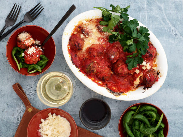 Muhkeat uunilihapullat kypsyvät uunissa tomaattikastikkeessa hautuen.