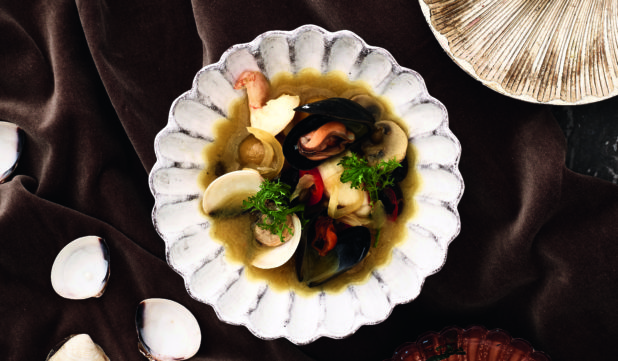 Valkoviinillä ja sahramilla hunnutettu kala-äyriäiskeitto