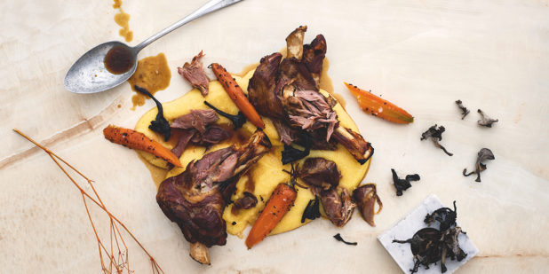 Lammas, potka, sienet niistä syntyy maistuva pata. Lammas-mustatorvisienipata tarjoillaan polentan sekä mallasporkkanoiden kanssa.