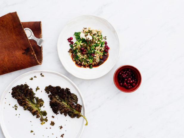 Kahden kaalin laatikko, lihaliemikastike ja lehtikaalisipsit