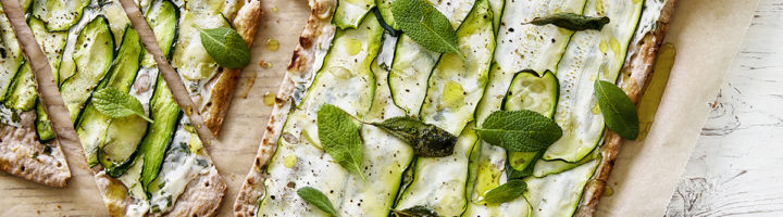 Valmista alle puolessa tunnissa kesäkurpitsaflatbread, jossa pohjalla on kermainen tuorejuusto ja päällä ihanan aromaattista salviaa.