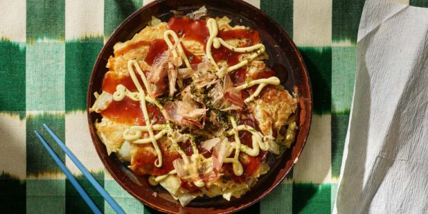 Kuohkea kaalipannukakku okonomiyaki on japanilainen arjen klassikko. Viimeistele kastikkeilla vastustamattomaksi.