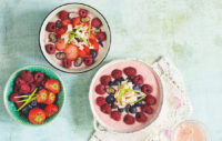 Raparperi-mansikka-kookoskulhot valmistuvat hetkessä. Koristele kauden marjoilla tai syötävillä kukilla.