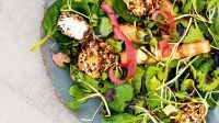 Kokeile raikasta raparperia pähkinäisten vuohenjuustopalleroiden pariksi salaattiin.