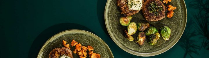 Yrttivoilla silatut riistapihvit maistuvat paistettujen ruusukaalien ja sienten kanssa. Jos kaipaat seuraksi myös perunoita, tee kuorellisia venepottuja uunissa.