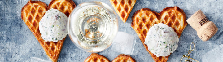 Silli, kuohuviini ja vohvelit. Kylmä sillijäädyke ja lämmin vohveli on lyömätön yhdistelmä. Jos pakastaminen ei innosta, tarjoa sillijäädyke jäädyttämättä moussen tapaan.