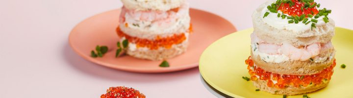 Trendikäs voileipäkakku saa nyt uuden olomuodon skagen-leivoksina. Minivoileipäkakut sopivat sekä suolaiseksi palaksi kuohuviinin seuraan että keväisen piknikin evääksi.