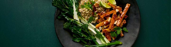 Uunissa rapeiksi paistuneet tofutikut käännellään nopeasti pannulla mausteisessa liemessä. Lisänä lautasella on vihreitä pikapaistettuja kasviksia ja ateriajyviä.