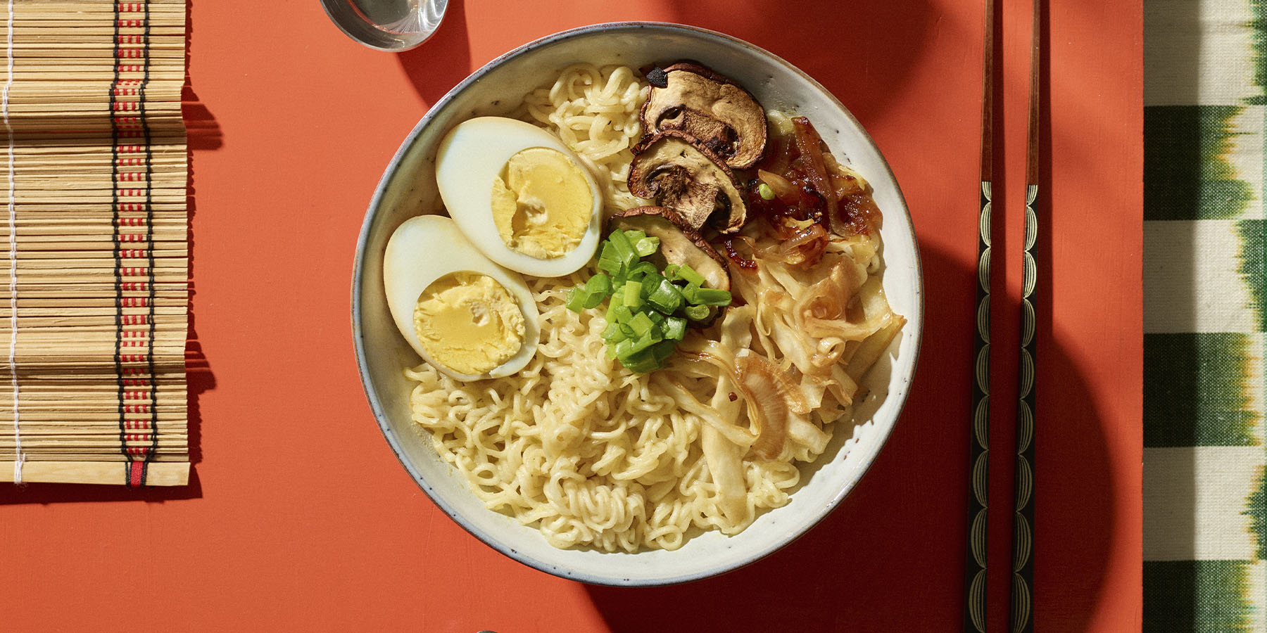 - Nosta nuudeliannoksen päälle kaali-sieniseos, kevätsipulisilppu ja kananmuna. Tarjoile heti.