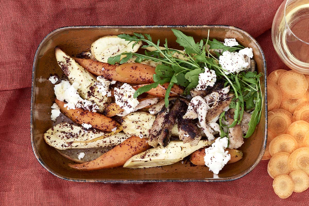 Paahdettu juuressalaatti valmistuu helposti yhdessä uunivuossa tai pellillä. Viimeistele salaatti aromikkaaksi kukkaisen sitruksisella sumakki-mausteella, jota käytetään paljon Lähi-idän keittiössä.
